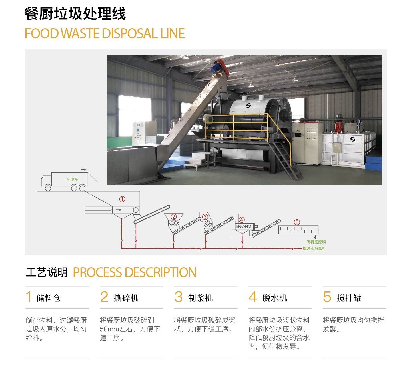 針對國內餐廚垃圾處理現狀,常熟首譽推出了密封性、安全性良好,整套設備配備負壓除臭系統,整個生產車間配備除臭植物噴啉,整個系統全自動控制,餐廚垃圾處處理系統主要工藝如下: