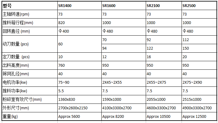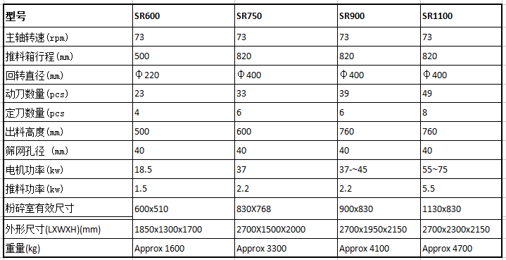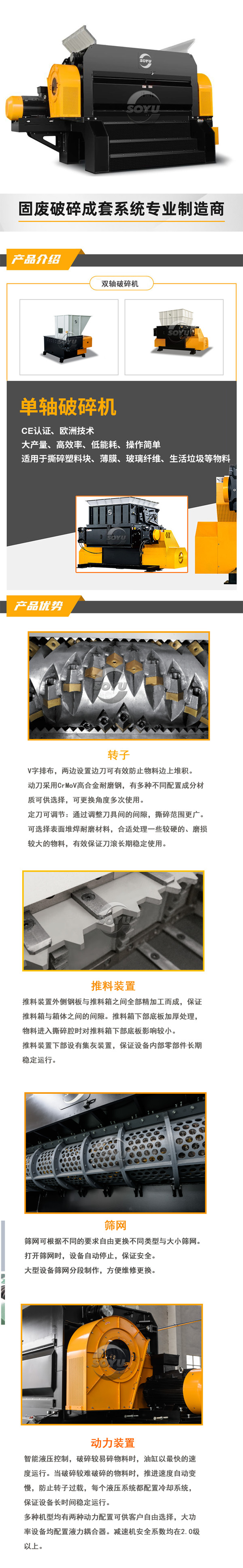 • 單軸撕碎機系列,通過CE認證,可用于撕碎較難破碎的塑料、橡膠、纖維、紙張、木材、電器件、電纜等實心物料,如:水口料,膠頭、PET瓶、硬紙板、電路板、木頭、塑料桶等。用戶可根據物料大小和處理量來選擇相應的機型。如用戶需破碎特別硬的物料,如:尼龍、ABS、PC等高強度工程塑料時需說明情況。